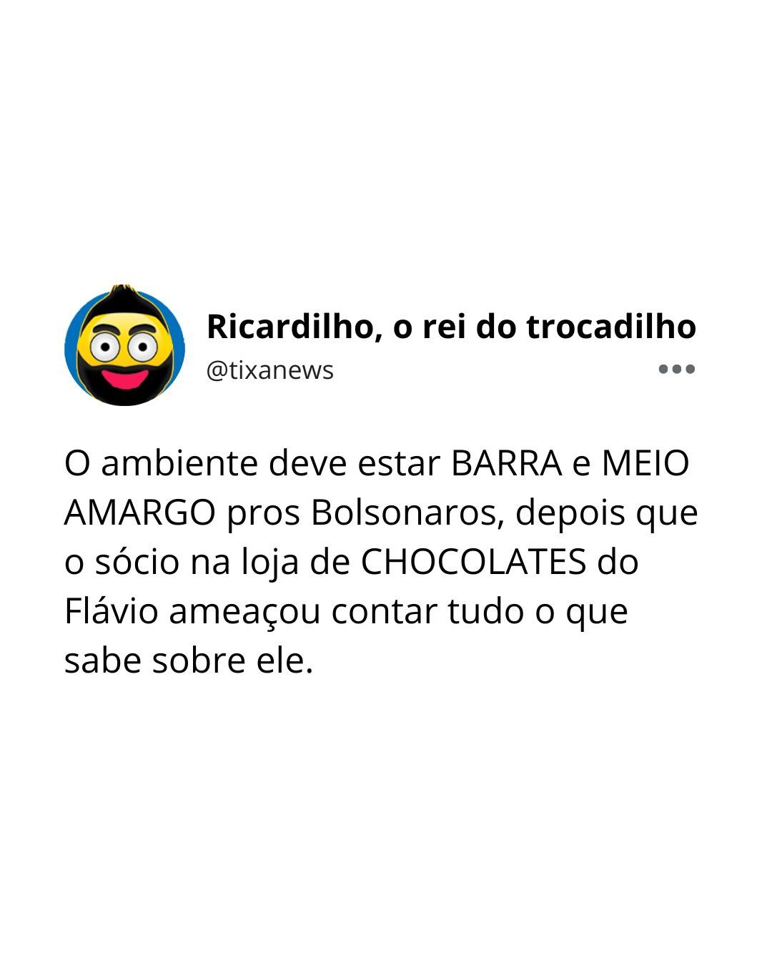 🍫Mas a treta mesmo do dia foi revelada pelo repórter Rodrigo Rangel, do site Metrópoles, BRASEW. O sócio do Flavitcho Bolsonaro naquela lojinha de chocolates que era suspeita de ser usada para lavar dinheiro está ameaçando contar tudo o que sabe. O nome dele é Alexandre Santini e ameaça falar do Queiroz, rachadinha, tráfico de influência enquanto o pai era presidente. Tudo isso porque Flavitcho não quis pagar 1,5 milhão de pilas que o senador teria de dívida com o tal Santini. Ele ainda disse que Flávio chegou a dizer que queria ver ele ir na Justiça cobrar o dinheiro e que não ia dar em nada porque ele, Flavitcho, é poderoso. Ui!!! Que meda, BRASEW.